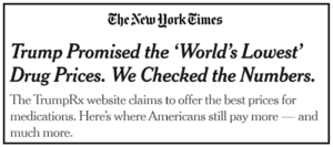A new analysis by the New York Times found that Trump’s boasts were, simply put, “not true.” The Times discovered that “the drugs listed on TrumpRx can cost American patients up to hundreds or thousands of dollars, while a patient walking into a German pharmacy pays next to nothing.”