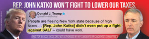 Donald Trump, a native New Yorker, tore into Katko and his fellow New York Republicans for rolling over and allowing the SALT property tax deduction to be capped, exploding taxes for thousands of hardworking New Yorkers.