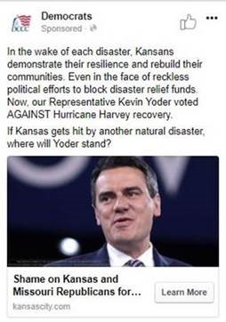 This week, the DCCC launched a significant ad blitz targeting Representative Kevin Yoder over his vote against disaster relief funds for victims of Hurricanes Harvey and Irma. The ad blitz includes 60-second radio ads that target commuters in the Kansas City market and digital ads on Facebook and Instagram that target persuadable voters in Yoder’s district.