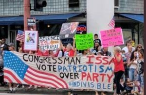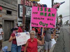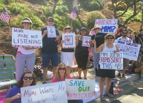 - Politico California Playbook: “Constituents of Rep. Mimi Walters have complained that she hasn’t held a town hall meeting in her CA-45 district since announcing her support — and casting her vote — for Obamacare repeal…A non-partisan, grassroots coalition of citizens lined the Lake Forest 4th of July Parade route today to reach Rep. Mimi Walters. About 25 constituents held signs and chanted “Country Before Party” as Rep. Walters passed by in a Mercedes.”