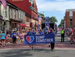 - “In years past, Comstock’s campaign team has been largely unopposed at the Leesburg parade. This year, however, Dump Comstock members were out in force, handing out their own lawn signs, buttons and bumper stickers.”