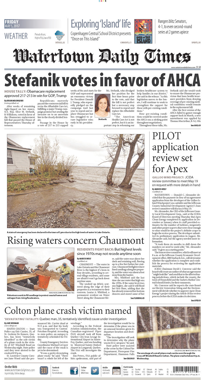 - NY-21: Watertown Daily Times: Stefanik votes in favor of AHCA