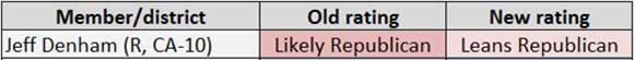 “Out west, Rep. Jeff Denham (R, CA-10) is a frequent Democratic target who won by six points in 2012 and 12 in 2014. He faces a rematch with Michael Eggman (D), a beekeeper. If there is a down-ticket drag from Trump these are two places we might see it…”