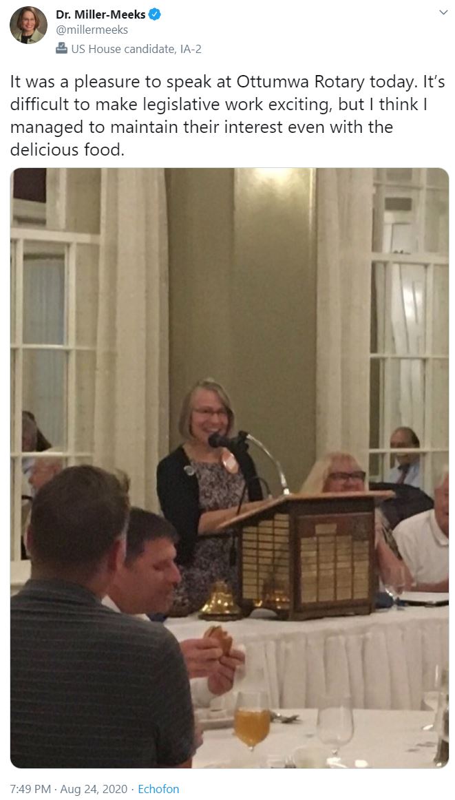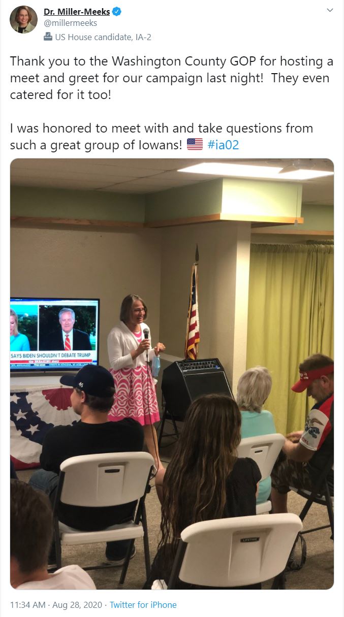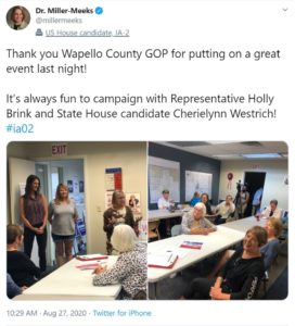 “If the spread of this virus isn’t contained, Iowa students can’t safely go back to school and businesses can’t get back on their feet. Instead of doing her part to look out for her friends and neighbors, Mariannette Miller-Meeks is irresponsibly hobnobbing at partisan, political events, making it more difficult to stop the spread. If Miller-Meeks won’t put people’s health and safety ahead of politics during a pandemic, how can Iowans expect her to be an independent leader in Washington?” asked DCCC Spokesperson Brooke Goren.