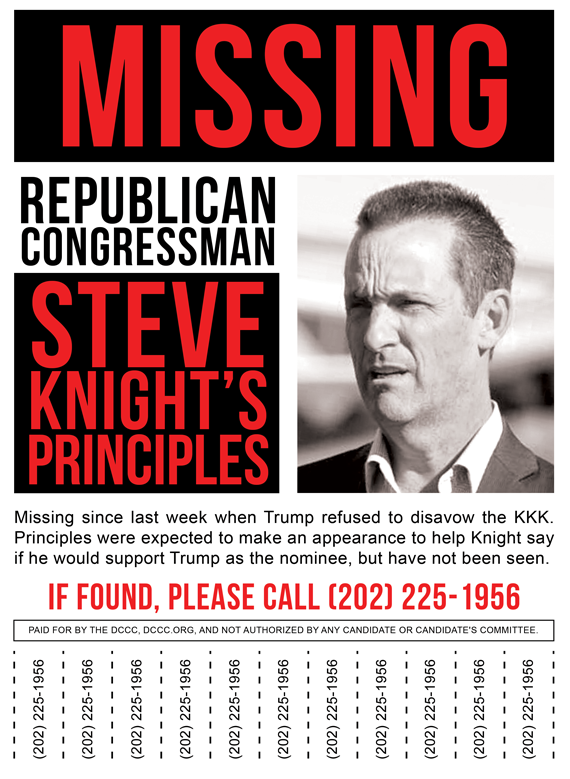 “Missing since last week when Trump refused to disavow the KKK. Principles were expected to make an appearance to help Knight say if he would support Trump as the nominee, but have not been seen. If found, please call 202-225-1956.”