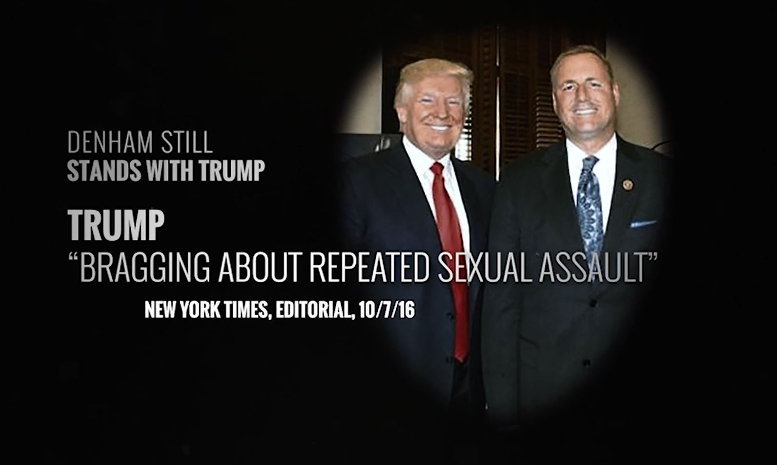 A new DCCC television ad is reminding voters that millionaire Congressman Jeff Denham continues to stand with Donald Trump despite the deluge of news about Trump’s history of sexual assault and grave warnings from both military and business leaders.