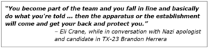 Crane, meanwhile, got nearly $600,000 from Republican leadership – a clear sign that Crane is dependent on D.C. party bosses, who are increasingly worried about this seat. To quote Crane himself: