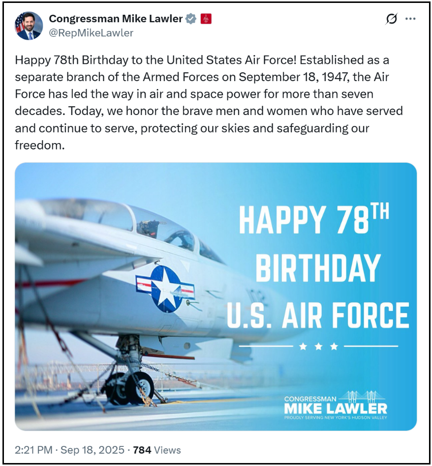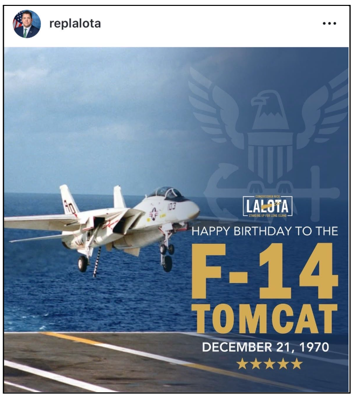 Well this is awkward…in an attempt to celebrate the United States Air Force’s 78th birthday, Mike Lawler posted a photo of a NAVY F-14 Tomcat aircraft – which appears to be taken from a literal Navy aircraft carrier.